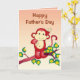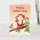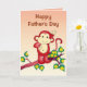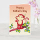 Auf dieser niedlichen und fröhlichen Vatertagskarte können Sie den Vor- und Innentext einfach personalisieren oder entfernen. Es zeigt einen roten Affen auf dem Ast eines Baumes mit grünen Blätter.