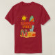 Ein spielerisches Sommerdesign mit Surfbrett, Flip Flops, Muscheln, einer hellen Sonne und der Phrase "Summer Vibes" über einem Sandstrand.