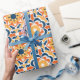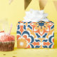 Chic verpacktes Papier mit Talavera Kacheldesign in Blau-, Orange- und Gelbtönen.