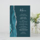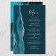 Die links Seite dieses eleganten, modernen Hochzeitsmenüs besticht durch eine aquamarine, blaue Aquarellgrenze, die mit Imitaten aus silberem Glitzer bestickt ist. Der anpassbare Text kombiniert silbergraue Handschrift-Skripte und Copperplate-Schriftart auf einem dunklen aquamarinen Hintergrund. Auf der Rückseite ist ein aquamarines und silberfarbenes Design erkennbar.