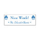 Ce design de timbre en caoutchouc positif comporte le message inspirant "Nice Work!" et un nom de tuteur personnalisé. Il dispose également d'icônes décoratives de bonhomme de neige. Il pourrait être utilisé par un enseignant, un éducateur ou un tuteur pour évaluer le travail des élèves, afin de reconnaître qu'un étudiant a fait un travail exceptionnel.