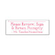 Ce cachet en caoutchouc clair comporte le message "Veuillez vérifier, signer et retourner rapidement", ainsi qu'une ligne où une signature ou des initiales peuvent être écrites ci-dessus. Il porte également le nom d’un enseignant ou d’un éducateur sur mesure. Il peut être utilisé par un enseignant, un tuteur ou un éducateur pour demander à ses parents ou tuteurs d’examiner et de reconnaître la note obtenue par un étudiant à un examen, à un examen, à un papier, à un projet ou à une autre affectation scolaire.