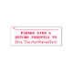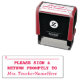 Ce modèle de tampon de base comporte le message "VEUILLEZ SIGNER ET RETOURNER RAPIDEMENT À", ainsi qu'une ligne pour une signature ou des initiales à écrire ci-dessus. Il porte également le nom d’un éducateur personnalisé. Il pourrait être utilisé par un enseignant, un éducateur ou un tuteur pour demander aux parents ou aux tuteurs d’un étudiant de revoir et de reconnaître la note reçue par un étudiant lors d’un test, d’un quiz, d’un examen papier ou d’une autre affectation scolaire.