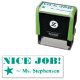 Ce timbre en caoutchouc positif comporte le message de motivation "NICE JOB!" et le nom d'un enseignant customisé. Il dispose également d'une icône d'étoile décorative. Il pourrait être utilisé par un enseignant ou un éducateur pour marquer les affectations, pour reconnaître que l'étudiant a fait un excellent travail.