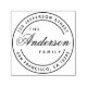 Un élégant timbre d'adresse de retour rond. Au centre, le nom est écrit dans un élégant script calligraphique, avec le mot "famille" en petits casquettes sous lui. . Il est entouré d'adresse, écrite entre deux cercles, avec les casquettes, la rue en haut, la ville et l'état en bas. Le cercle plus petit est interrompu.