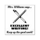 Enseignant dit excellente écriture sur mesure arts créatifs encouragement enseignant pré-encré timbre. Timbre d'enseignant personnalisé amusant orné d'une illustration au stylo et au crayon. Customisez-le en éditant le nom de l'échantillon et louez et encouragez le texte personnalisé.