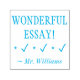 Ce design de timbres en caoutchouc encourageant comporte le message inspirant "WONDERFUL ESSAY!" et le nom d'un tuteur customisé. Il pourrait être utilisé par un enseignant, un éducateur, un instructeur ou un tuteur lorsqu'il s'agit de marquer les affectations, pour indiquer qu'un élève a bien fait.