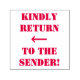 Ce design d'estampille en caoutchouc comporte le message "RETOUR À L'ENVOI !", ainsi qu'un symbole de flèche. Il pourrait être utilisé pour indiquer que le courrier reçu peut avoir été mal adressé et doit être retourné à l'expéditeur.