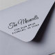 Timbre d'adresse de retour avec votre nom de famille dans un script élégant et votre adresse dans une simple typographie.