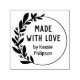 Fabriqué avec un timbre d'amour auto-encre avec une feuille de baies simplement dessinée. Donnez à vos produits faits à la main ou à la maison une touche personnelle avec ce timbre personnalisé fait d'amour auto-encre avec votre nom à l'intérieur d'une couronne de baies.