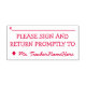 Cette conception simple et conviviale d'estampille en caoutchouc comporte le message "S'IL VOUS PLAÎT SIGNER ET RETOURNEZ RAPIDEMENT À", ainsi qu'une ligne que la signature ou les initiales pourraient être écrites ci-dessus. Il porte également le nom d’un éducateur personnalisé. Il pourrait être utilisé par un enseignant, un éducateur ou un tuteur pour demander aux parents ou aux tuteurs d’un étudiant de revoir et de reconnaître la note reçue par un étudiant lors d’un test, d’un quiz, d’un examen papier ou d’une autre affectation scolaire.
