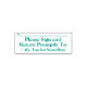 Cette simple estampille en caoutchouc comporte le message "Veuillez signer et retourner rapidement à", et une ligne pour une signature ou des initiales à écrire ci-dessus. Il comporte également un nom d’éducateur personnalisable. Il pourrait peut-être être utilisé par un enseignant, un éducateur ou un tuteur pour demander aux parents ou tuteurs d’un étudiant de réviser et de reconnaître la note obtenue par un étudiant à un examen, un test, un essai, un questionnaire ou une autre affectation scolaire.