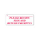 Cette simple estampille en caoutchouc comporte le message "VEUILLEZ RÉVISER, SIGNER ET RETOURNER RAPIDEMENT", ainsi qu'une ligne indiquant qu'une signature ou des initiales pourraient être écrites ci-dessus. Il pourrait peut-être être utilisé par un enseignant ou un professionnel de l'administration pour demander que quelqu'un examine et reconnaisse le contenu d'un document.