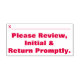 Cette estampille en caoutchouc de base comporte le message "Veuillez réviser, initial et retour rapidement.", ainsi qu'une ligne indiquant qu'une signature ou des initiales pourraient être écrites ci-dessus. Il pourrait peut-être être utilisé par un enseignant ou un professionnel de l'administration pour demander que quelqu'un examine et reconnaisse le contenu d'un document.