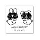 Le timbre en caoutchouc présente le personnage chinois "囍 double bonheur" avec des lapins de dessin animé écrivant avec un monogramme personnalisé simple et moderne des noms de la mariée et du marié et de la date du mariage. Le sens littéral de 喜 (Bonheur) est la joie, tandis que 囍 (Bonheur double) sont des personnages chinois jumeaux de joie, symbole des célébrations du mariage. Le double motif de bonheur apparaît souvent sur les objets décoratifs associés aux mariages.
