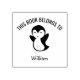 Timbre en caoutchouc personnalisé / plaque avec un mignon pingouin heureux et les mots personnalisables "Ce livre appartient à" courbé un peu autour du pingouin. Vous pouvez customiser le nom ou le supprimer, si vous le souhaitez, de sorte que l'enfant n'utilisera que le pingouin et les mots au-dessus sur le timbre du livre, puis signer son nom à la main (si l'enfant est plus âgé).