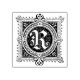 Lettre R première lettre de style gothique vintage calligraphie dessinée à la main. La lettre orange R est centrée dans un cadre circulaire et un cadre extérieur carré. Bordée de vagues, de points et de lignes décoratives.