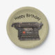 Diese Papiertafel zeigt eine alte, Vintage, handgefertigte schwarze Schreibmaschine auf einem gemusterten, marmorierten Hintergrund. Passen Sie den Happy Birthday Text mit den Vorlagen an.