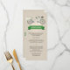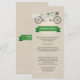 Les mariages sur le thème du vélo sont une tendance amusante dans les mariages thématiques. Sur cette fausse carte de menu mariage arrière - plan de lin, un vélo en tandem symbolise le couple marié à monter ensemble. Le siège de la mariée est entouré d'un voile mariage et le siège du marié est entouré d'une cravate avant déliée enroulée autour du guidon. Un bouquet de mariée est placé dans le panier de la moto. Le titre de la carte se distingue dans une bannière verte sous le vélo avec le menu imprimé en dessous. Les noms du couple et la date de l'événement s'affichent dans une bannière verte au dos. Disponible avec des produits assortis avec une option pour le vélo de mariée et de mariée.