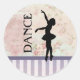 Niedliche Aufkleber mit einer Silhouette einer Ballerina auf hübschem Hintergrund. Diese elegante Ballett-Tänzerin ist auf ihren Zehen stehend, en pointe mit ihren anmutig ausgestreckten Armen. Das Wort "Tanz" neben diesem eleganten Tänzer geschrieben. Der Hintergrund besteht aus einem schäbig Vintag aussehenden Muster mit Blume-Blüten. Der untere Teil des Designs hat Vintage Lavendelstreifen, die abwechselnd in dunklen und hellen Farben gehalten werden.