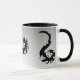 Diese Tasse verfügt über drei lebendige, spielerisch schwarze Tanzdrachen Set auf einem silbermetalischen Hintergrund mit schwarzem Trimm.