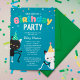 Niedliche Geburtstag Party Einladung für Kleinkinder. Die Geburtstagsfeier lädt zwei Katzen ein, die unter farbenfrohen Konfetti tanzen. Eine Katze ist schwarz, die andere weiß. Die Katzen tragen Polka dot Party Hüte. Der Geburtstag ist in einem bunten Ballon-Schriftart geschrieben. Die Rückseite weist ein gelbes kariertes Muster auf. Eine bunte Geburtstagsfeier für Kinder!