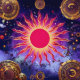 "Tanzfeuer des Kosmos" Die Sonne: Die hypnotischen Wirbel der Sonne und die goldenen Fackeln verleihen der Bewegung die Illusion, die Flammen der Sonne seien lebendig. Ein faszinierendes Meisterwerk, das Energie, Wärme und ein himmlisches Gleichgewicht mit den Farben Rot, Orange, Gelb und Blau zelebriert.