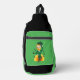 Sling Bag mit einer Illustration von einem lächelnden, fröhlich tanzenden Kobold mit einem grünen Anzug, einer Bogen-Krawatte und einem Bowlerhut; mit schwarzen Noten und einem gelben und orangefarbenen Regenbogen im grünen Hintergrund. Ein perfektes Design, um den St. Patrick's Day zu feiern!