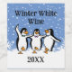Tanzpinguine Design Weinetikett auf schneebedecktem Hintergrund, mit anpassbarem Text und Farbe.