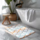 Enhance the aesthetic of your bathroom with this sophisticated bath mat design. The elegant combination of modern pastel tones, including shades of blue, orange, and gray, creates a stylish and contemporary look. The geometric seamless pattern on a crisp white background adds a touch of refinement to your space. Elevate your bathroom decor with this chic and trendy bath mat.