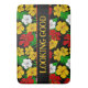 Salle de bain noire à motifs rouge, jaune et blanc fleurs d'hibiscus tropicaux et feuilles de palmiers verts. Au milieu se trouve le guillemet "LOOKING GOOD" qui est personnalisable pour que vous puissiez ajouter votre propre libellé, ou supprimer si vous préférez
