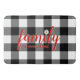 Design en plaid de buffle noir et blanc avec marguerite blanche et texte de famille rouge.