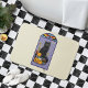 Un chat noir assis sur un tas de livres à la bougie rouge, des citrouilles, des susans aux yeux noirs et un papillon en verre taché sur un fond de violet et de jaune clair.