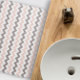 Ce tapis de bain est doté d'un motif chevron moderne en rose et gris brosse.