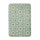 Geometric pattern with interlocking hexagons in green and teal, featuring brown hexagons in the center. The design is symmetrical and retro-inspired.