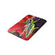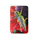 Ce tapis de bain animal présente une sauterelle verte, jaune et noire brillante perchée au centre violet d'une fleur aux pétales rouges magnifiques.