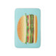 Ce tapis de bain présente une délicieuse illustration d'un hamburger. Le hamburger est fait de viande, laitue verte, tomates rouges, oignon, tranche de fromage et quelques cornichons. Le petit pain a l'air frais et il y a des graines de sésame sur le dessus.