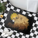 Portrait de profil d'un lion avec art tribal. Un soleil de mandala jaune s'installe derrière le lion sur fond de noir.
