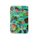 Un abstrait animé dans les tons turquoise, turquoise, orange, rouge orange, noir, blanc, or métallique et les tons verts.