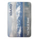 En regardant à l'est de Sandpoint, je traverse le lac Pend Oreille (étang euh-ray) par un jour d'hiver; montagnes enneigées au loin. La glace s'est formée sur le rivage et s'étend à une partie du lac. Le blues et le gris sont les couleurs dominantes. Le texte "IDAHO" apparaît également. Et c'est un endroit pour ajouter du texte.