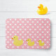 Un tapis de bain girly avec une mère canard en caoutchouc et ses canetons sur un arrière - plan de pois à coeur rose et blanc.