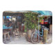 Sur ce grand Bath Mat - Décontracté, décontracté, à vélo, voici quelques-unes des choses qui composent le style de vie confortable représenté dans cette photo originale de ZoeSPEAK, d'un vélo bleu aqua penché contre un poteau devant un bar en plein air à Key West, Floride. Il y a un buisson verdoyant dans une baignoire, sous un auvent qui correspond à la couleur de la moto. L'intérieur, sombre, est rempli de tabourets de bar en bois, de parasols bleu d'aqua et de cobalt sur les tables. Un bar bleu aqua devant complète la photo colorée.