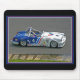 Une voiture de course, photographiée pendant qu'elle passe et se reflète dans une eau debout.