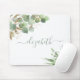 Une belle souris monogrammée avec aquarelles de feuilles d'eucalyptus vert clair et verdure avec des accents de parties scintillant or. Personnalisez avec votre nom dans un script vert sage avec des swashes.