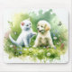 Aquarelle chaton blanc ludique avec un chiot dans l'herbe avec des papillons