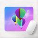 Trois montgolfières de couleur vive contre un ciel violet et bleu.
