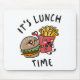 Quelle heure est le déjeuner ? C'est l'heure du déjeuner. Drôle de hamburger et frites en amour. Un match parfait pour les enfants ainsi que pour les adultes.