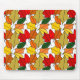 Ce pavé de souris a un design de feuilles qui se répètent pour faire un tas de feuilles dans les tons jaune, rouge, orange et vert.