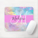 Nom monogramme irisé holographique de l'arc-en-ciel et pavé de souris initial. Votre nom personnalisé et votre monogramme sont écrits dans un élégant script écrit à la main avec un arrière - plan rose. Un cadeau d'anniversaire ou de Noël parfait !