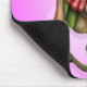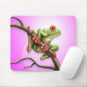 Une grenouille d'arbre verte est étée perché sur une branche devant un arrière - plan rose-clair. La grenouille regarde vers la droite avec une de elle est les yeux rouges lumineux évidents. Du petit les mains rouges et les pieds type sont enroulés autour d'une branche brune mince qui commence au fond de la conception et se relève et vers la gauche. Cette conception lumineuse et colorée fait un mousepad mignon et espiègle.